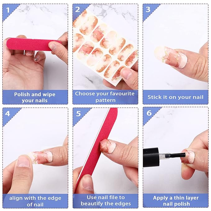 - Reliable and long lasting: these full wrap nail stickers are designed with stickiness, can be pasted in your nails easily and not easy to be unglued, also waterproof and can keep a beautiful look for several days; Warm tips: please try not to repeatedly stick on and replace, which is easy to weaken the sticky effect of nail stickers. High temperatures above 80 degrees will cause the product to melt slightly, please pay attention to use and storage