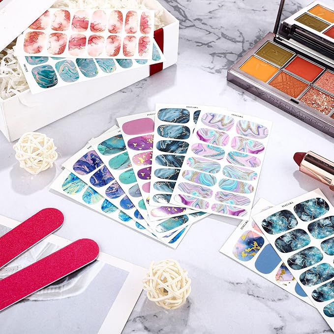 - Package content: there are 10 sheets of full nail wraps and 2 pieces of fingernail files, each sheet contains 14 pieces of nail polish stickers in different sizes, a variety of colors and designs for you to choose to make your nails look gorgeous at every moment