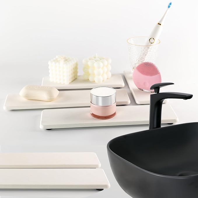- Made from natural Diatom mud and plant fiber, small holes within diatomite enable it have amazing water absorption. They could absorb water and gets dry in a few minutes. It makes the Bathroom Counter top more dry and tidy.