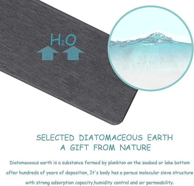 - Made from natural Diatom mud and plant fiber, small holes within diatomite enable it have amazing water absorption. They could absorb water and gets dry in a few minutes. It makes the Bathroom Counter top more dry and tidy.