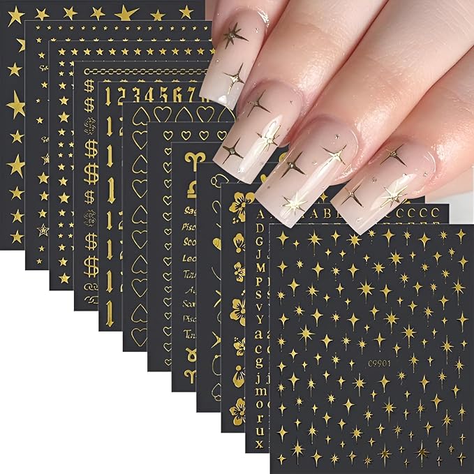 12 Sheets Gold Star Digit Heart Nail Art Stickers - 3D Self Adhesive Decals for Design and Decoration - Supplies Accessories for Women