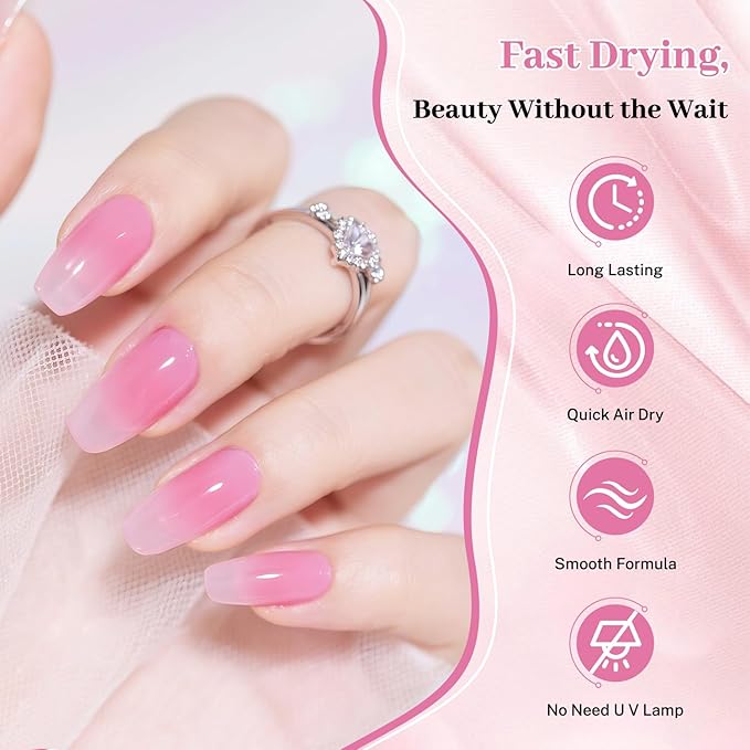- 【What you get】 A 16.5 ml bottle of jelly Sheer Pink nail polish.Such as summer pink rose petals bright and colorful, fingertips, a touch of powder wrapped in jelly-like translucent, and even the air is filled with the flavor of candy!