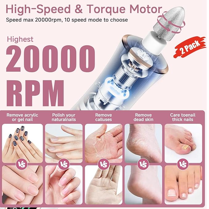 2 Pack Rechargeable Nail File Machine – 10-in-1 Design with 100PCS Sanding Belts for Smooth Finish, White