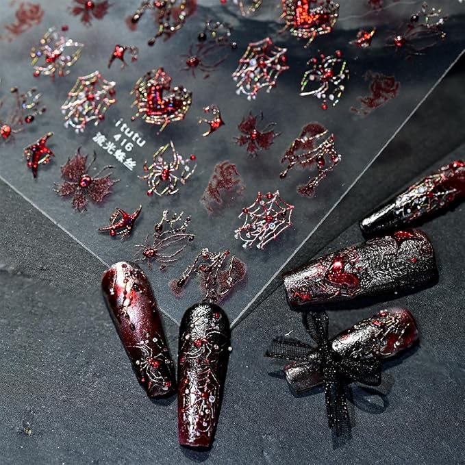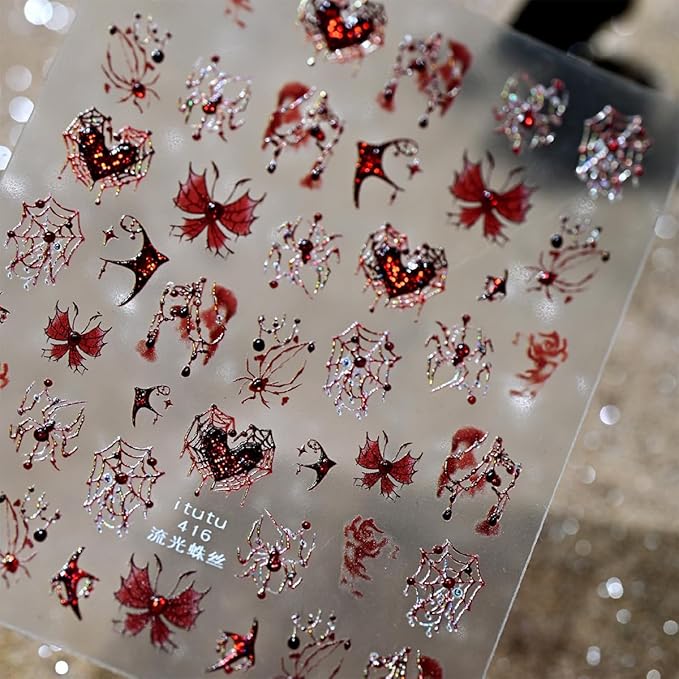 1 Sheets Halloween Nail Stickers for Nail Art 3D Self -Adhesive Spider Web Spider Nail Art Sticker Red Blood Drop Butterfly Heart Designs Stickers Horror Gothic Nail Decal for Women DIY Nail Salon
